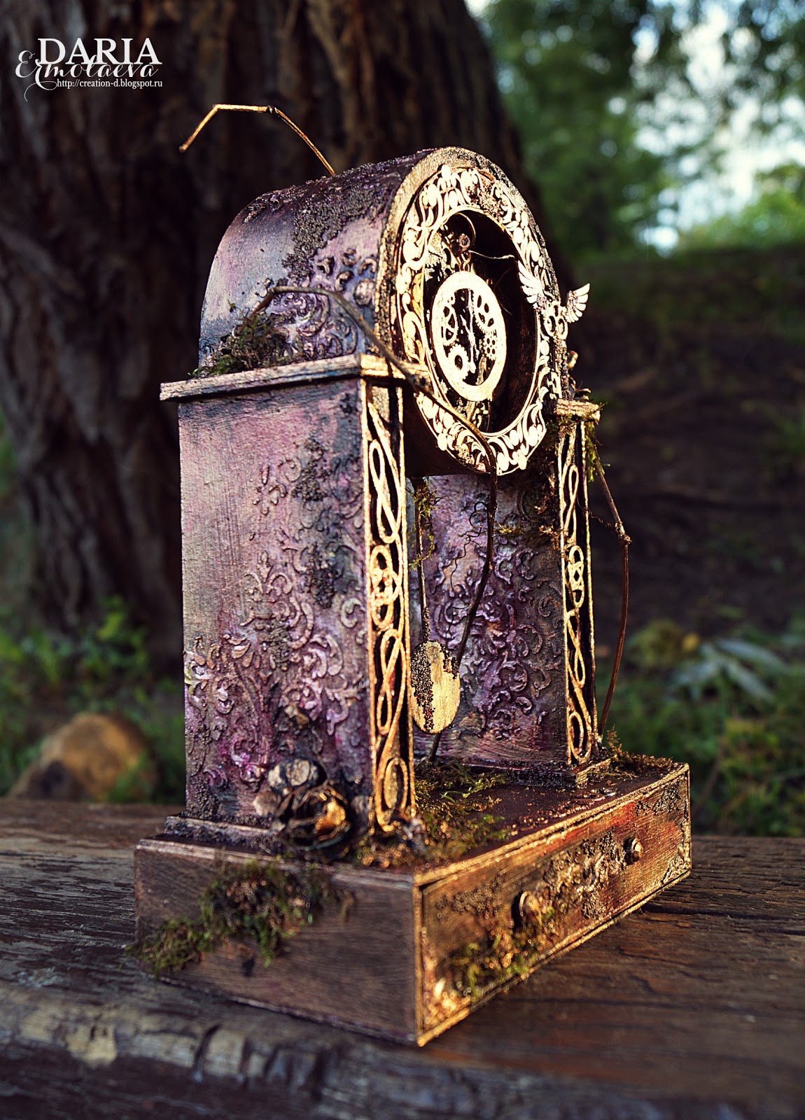 Часики полностью делала с нуля из пивного картона. При декорировании использовала много красок, спреи, чипики, текстурную пасту, и натуральные материалы (мох,веточки).